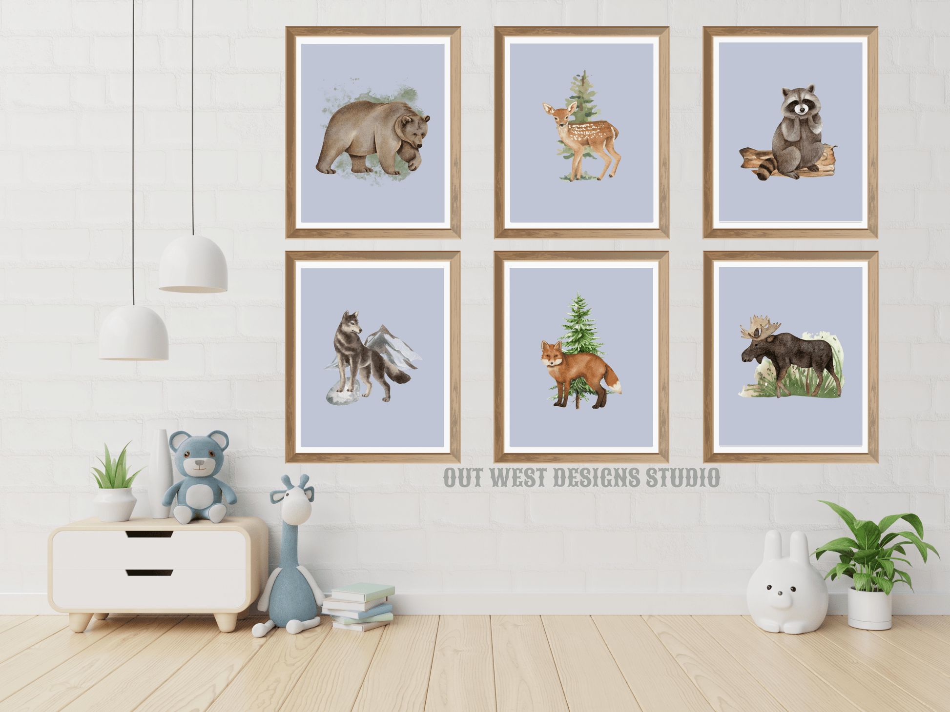 Woodlands animal print- babies, toddler boys + girls nursery home wall decor - fox deer raccoon wolf moose bear Canadian kids bedroom blue